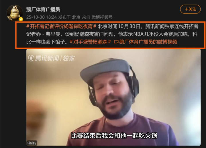 针对这场围绕“宵夜”的讨论,开拓者随队记者乔-弗里曼在接受采访时给出了不同的视角。他首先表示,那份食物看起来很美味,他甚至希望能知道餐厅地点,并与杨瀚森在赛后一同享用。弗里曼强调,在NBA的文化中,赛后外出用餐是“非常常见的”行为,他指出“几乎没有人在比赛后训练”。他解释了NBA紧凑的赛程,比如有时会达到四个晚上打3场比赛的强度,球员们在幕后付出了巨大努力,他们“确实需要休息”并且“确实需要吃东西”。为了佐证这一点,弗里曼回忆起大约10或15年前,他在洛杉矶报到时,曾亲眼目睹科比和他的队友在赛后深夜现身于一家热门餐厅。他总结道,联盟中的每个人都会这样做,粉丝们应当祝福他并关注其身体保护。